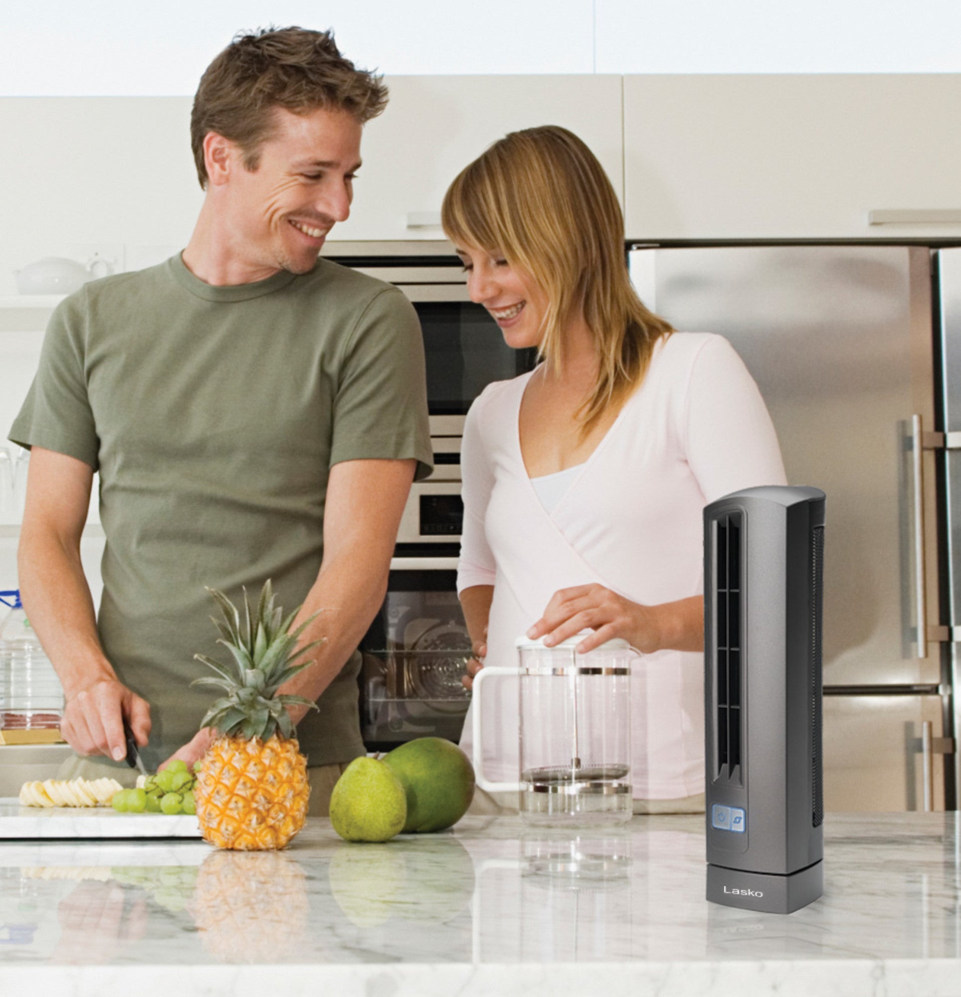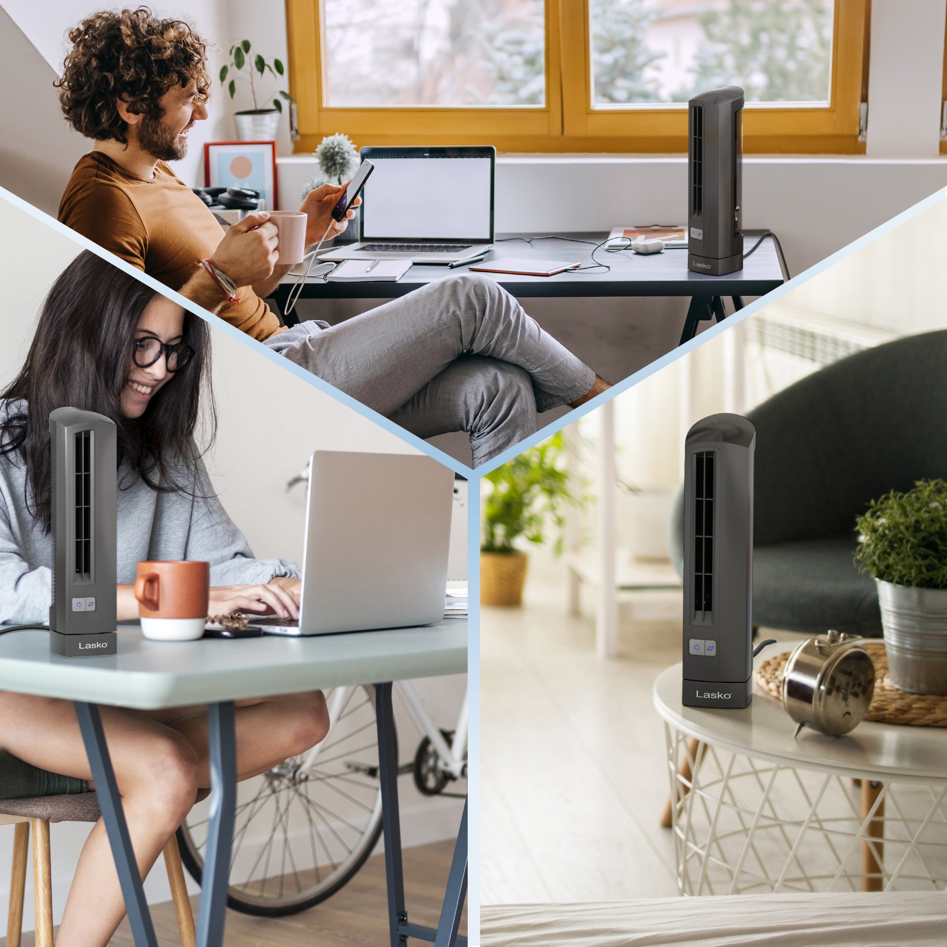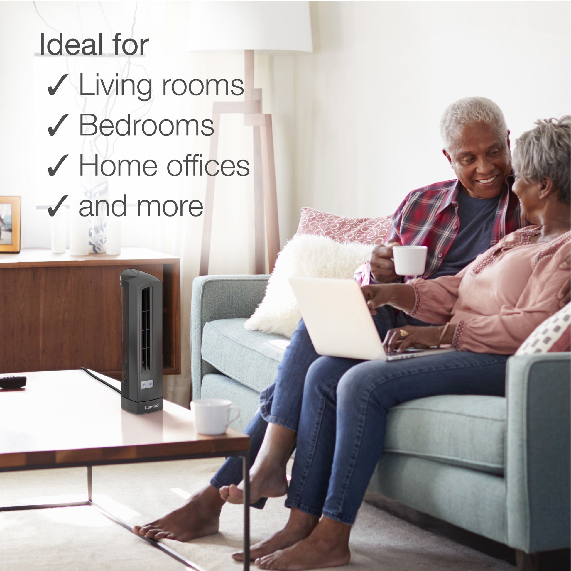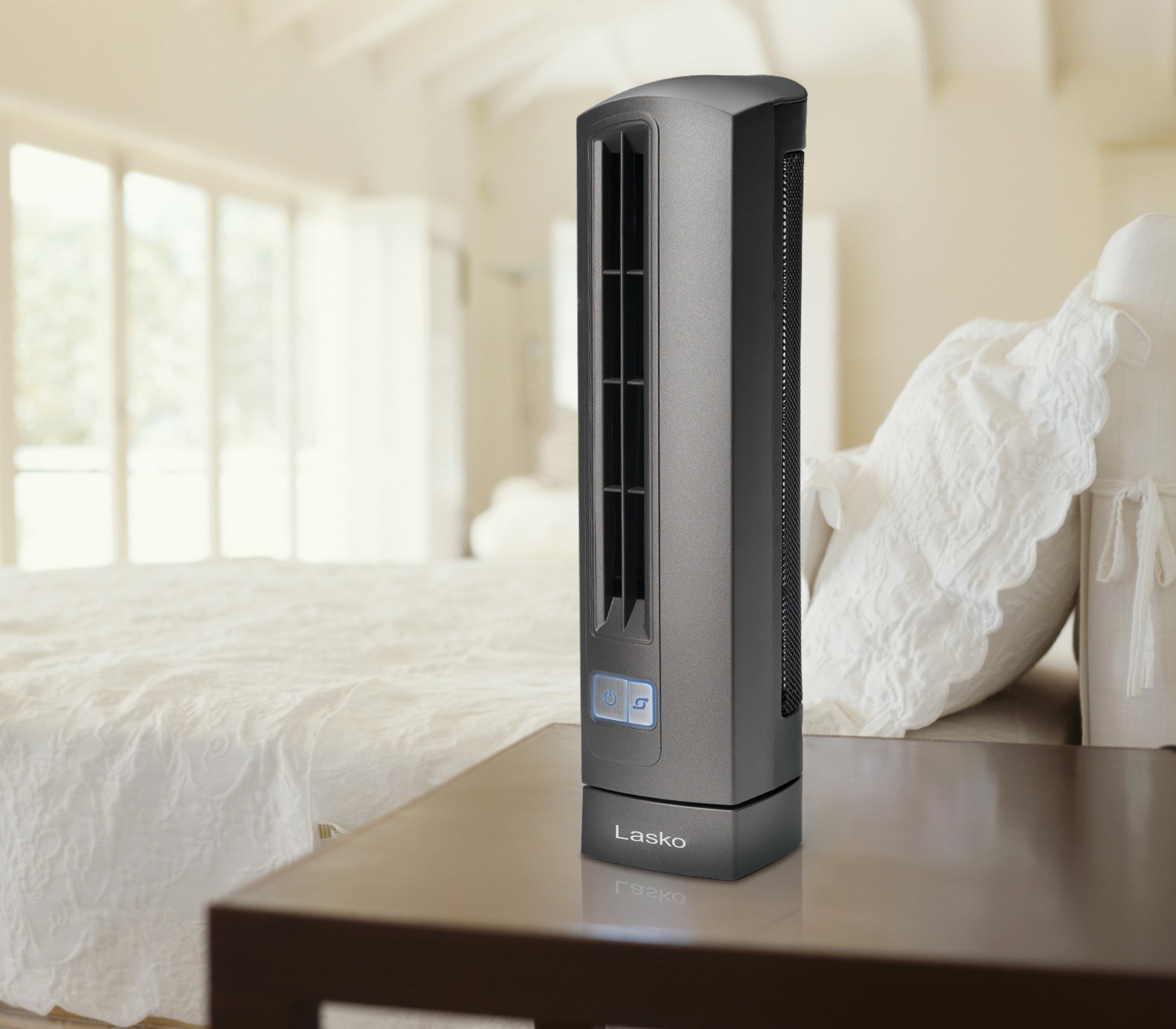 The Lasko Air Stik® oscillating fan features 2 quiet, refreshing speeds. Its ultra-slim design makes it a great addition to the office or anywhere space is at a premium. Quite powerful for its size, this small tower fan has a stylish look that blends well with other decor. This tabletop fan's electronic controls have a beautiful blue LED light illuminating its power and oscillation buttons. Includes Lasko's trusted, fused safety plug and complies with ETL certifications and standards. Comes fully assembled. 1-year limited warranty. Condition: New