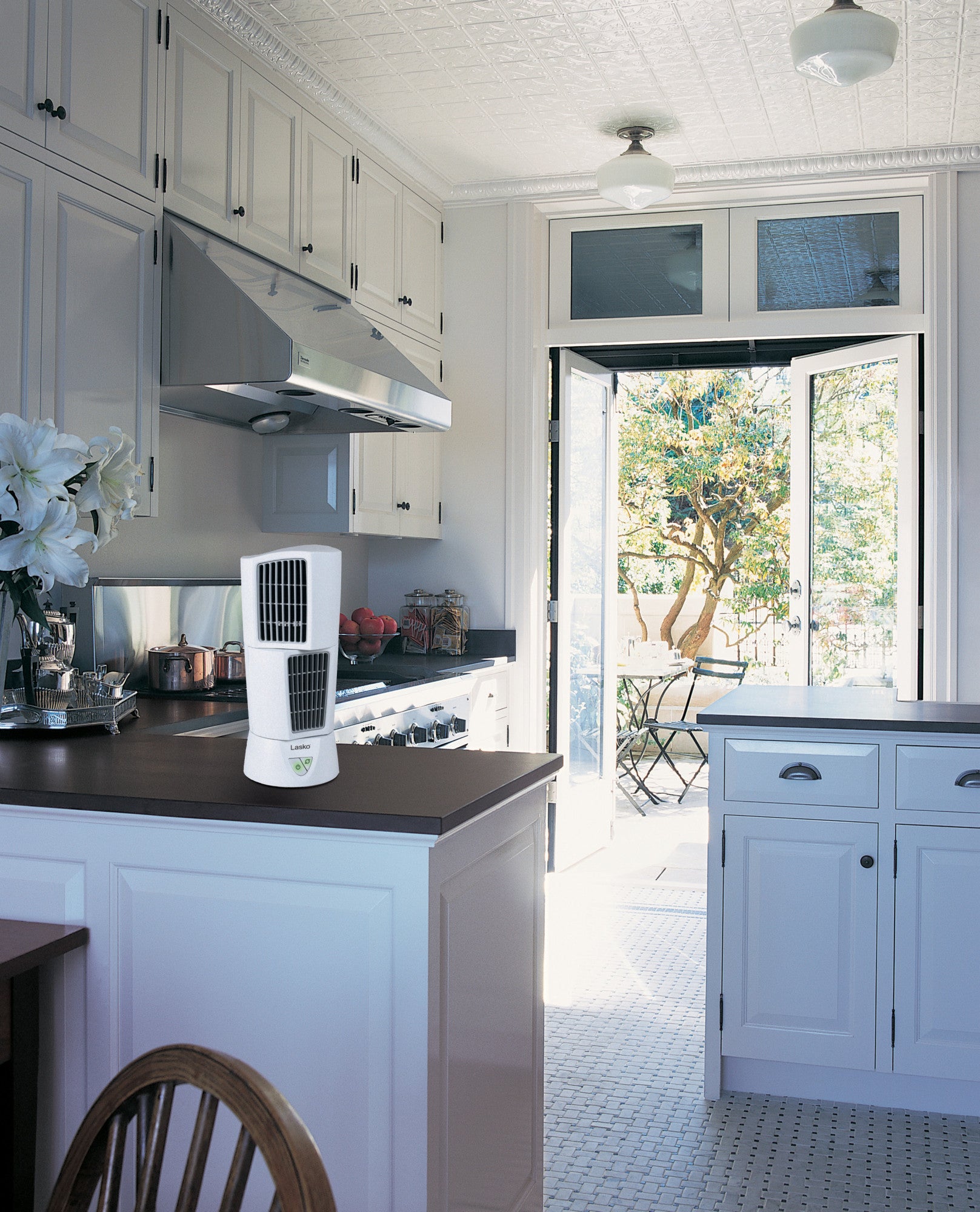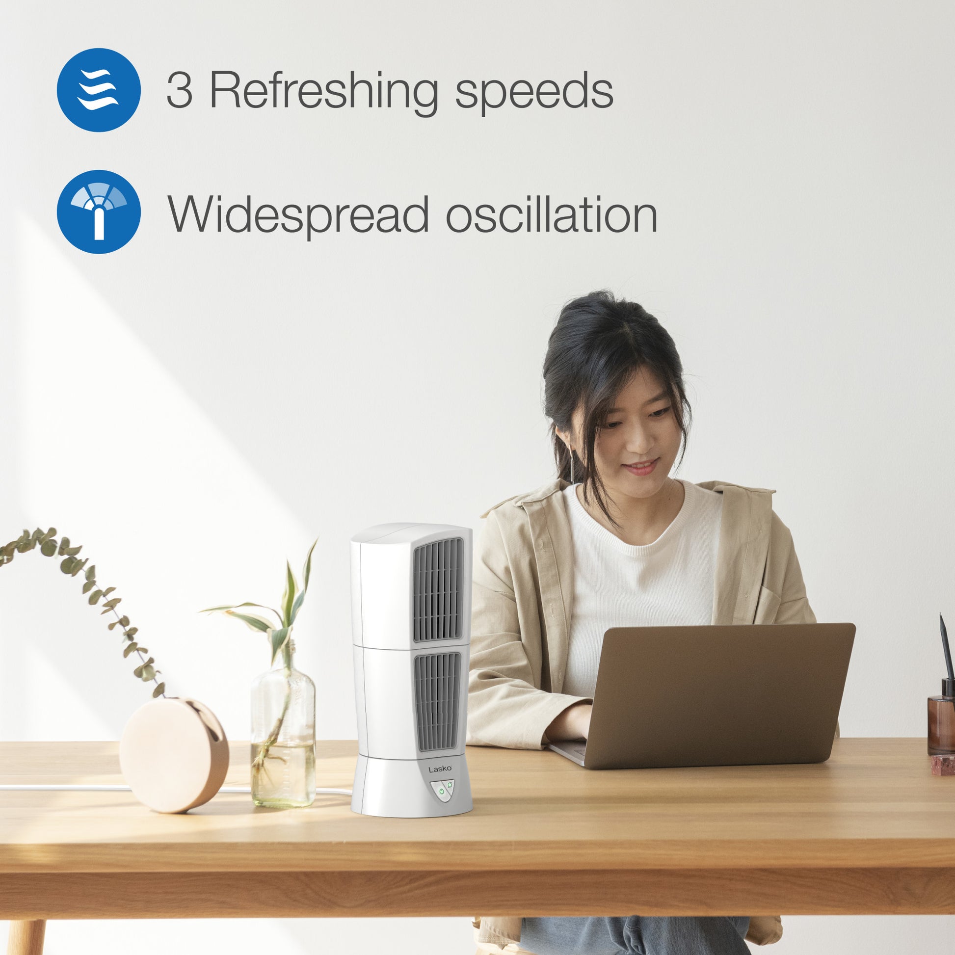 Lasko's space-saving PLATINUM Desktop Wind Tower® Oscillating Multi-Directional fan, in white, features 3 refreshing speeds. The top section of this desk fan pivots so you can aim airflow in two directions, plus the oscillation option moves the entire fan for widespread breeze coverage. Includes Lasko's trusted, fused safety plug and complies with ETL certifications and standards. Comes fully assembled. 1-year limited warranty. Condition: New