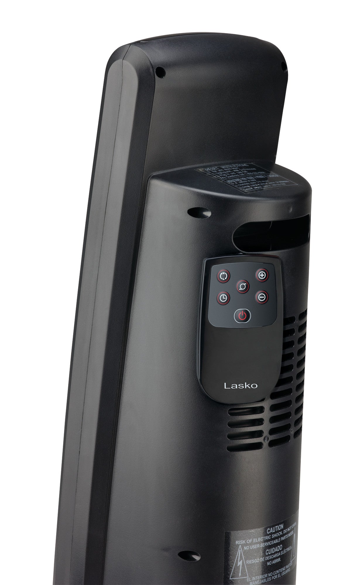 Quickly warm-up with a new Lasko Digital Ceramic Tower Heater with Remote Control. This heater is designed with an elongated heating element to distribute 1500 watts of comforting warmth. Features easy-to-operate Comfort Select controls with a digital display with 2 heat settings. Set the electronic timer for up to 8 hours and the heater will turn off automatically. It's widespread oscillation evenly disperses heat throughout the room. The adjustable thermostat maintains preferred temperature setting while saving on energy. The multi-function remote control operates all the heater functions from a distance. Safety features include overheat protection, a cool touch exterior and a safe ceramic element. Includes an easy-grip carry handle for portability from room to room and a convenient onboard remote control storage area. For indoor use only. 3 year limited warranty.