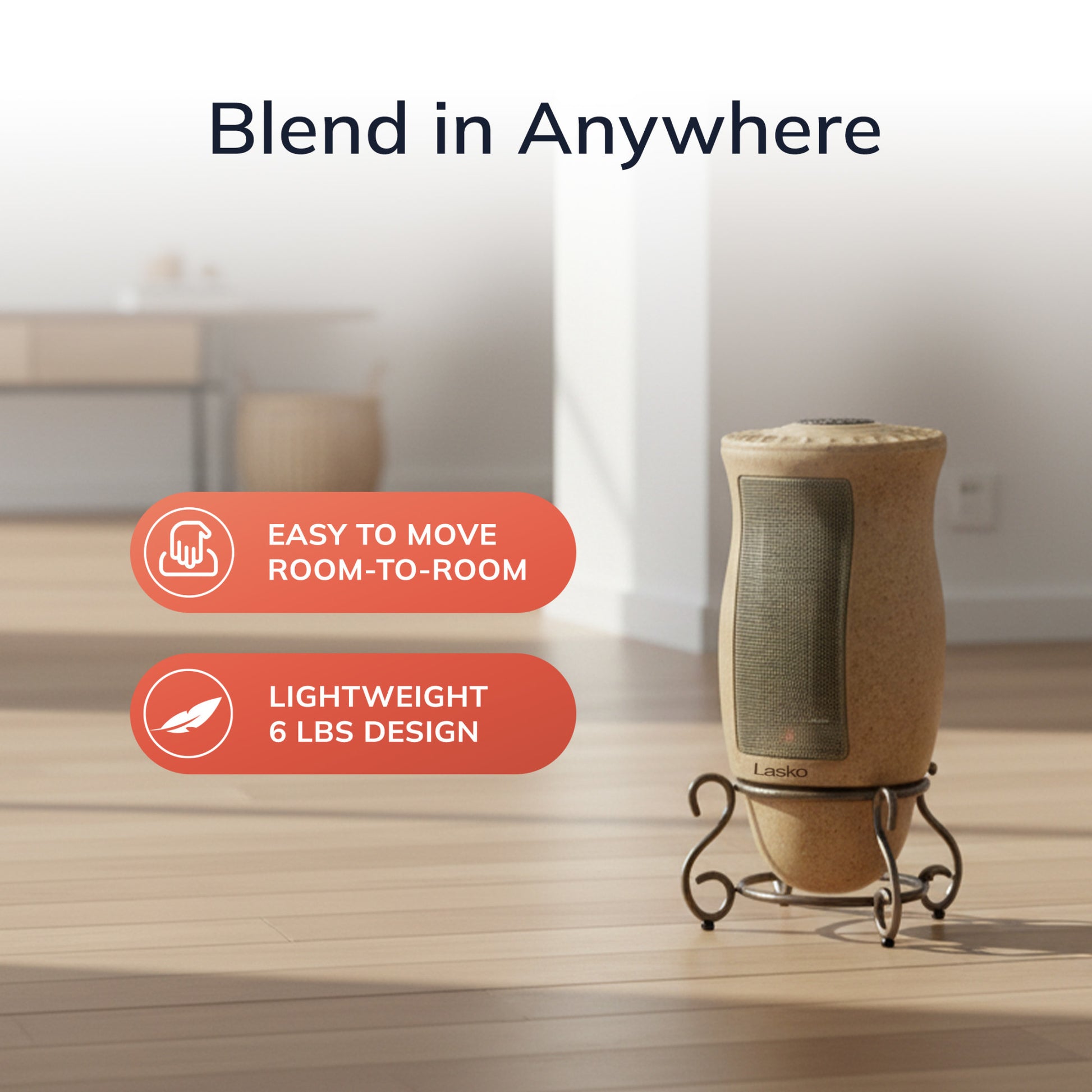 Chilly room? Try the Lasko Designer Series Oscillating Indoor Ceramic Space Heater. This uniquely designed heater provides warmth and charm to your living space, and blends beautifully into your existing decor. Features an adjustable timer, optional widespread oscillation, 2 heat settings, and thermostat-controlled mode for ultimate customization options for making your room cozy. Comes fully assembled and has a self-regulating ceramic element and automatic overheat protection for safety. The decorative metal scroll work on the base is a classic touch. This versatile space heater is an essential for almost any room in the home when days turn chilly. For indoor use only. Condition: New