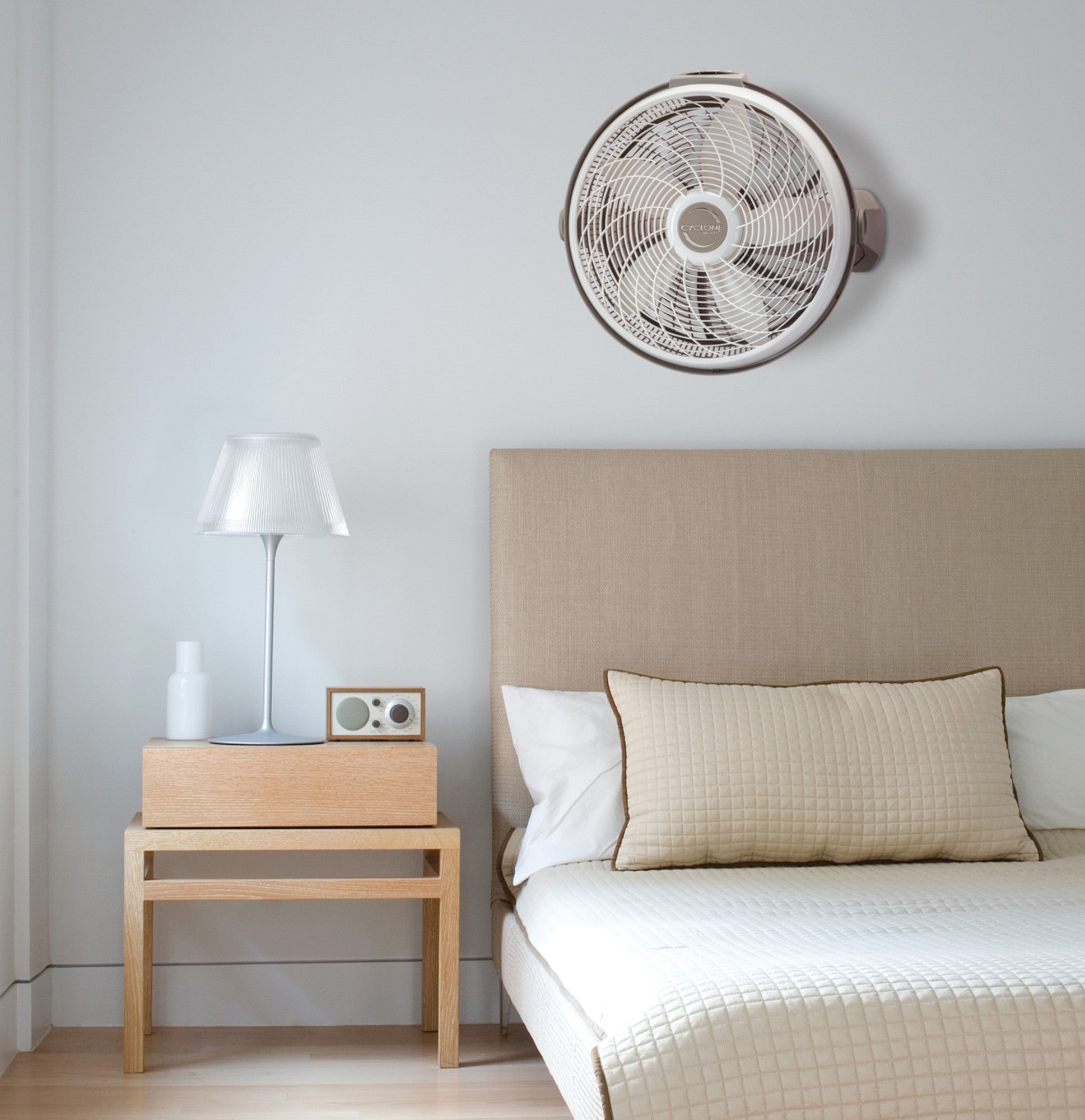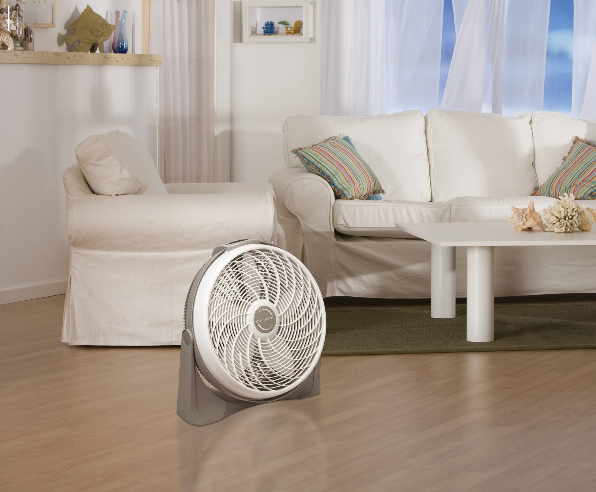 Combining a sleek look with powerful performance, this electronically controlled Lasko 20" Cyclone Power pivoting 3-Speed Air Circulator features five-paddle, 20-inch blades and a Cyclone grill that helps deliver a straight stream of air. To adjust the direction of the air, simply tilt the head of the fan. The unit's user-friendly control panel includes a power button, a button for selecting the speed and a button for setting the electronic timer. The included multi-function remote control makes it easy to adjust the settings from across the room. This Cyclone Fan features three powerful speeds, and comes with an electronic auto-off times that can be set to switch off the fan in 2, 4, or 8 hours. Ideal for large spaces, this high-output air circulator can be used on its own or in addition to an air-conditioning unit to help reduce cooling costs. It ca be easily converted from a wall fan to floor a floor fan without the need for special tools and assembly. Other highlights include quiet operation, a convenient carrying handle and a lightweight, portable design. Condition: New