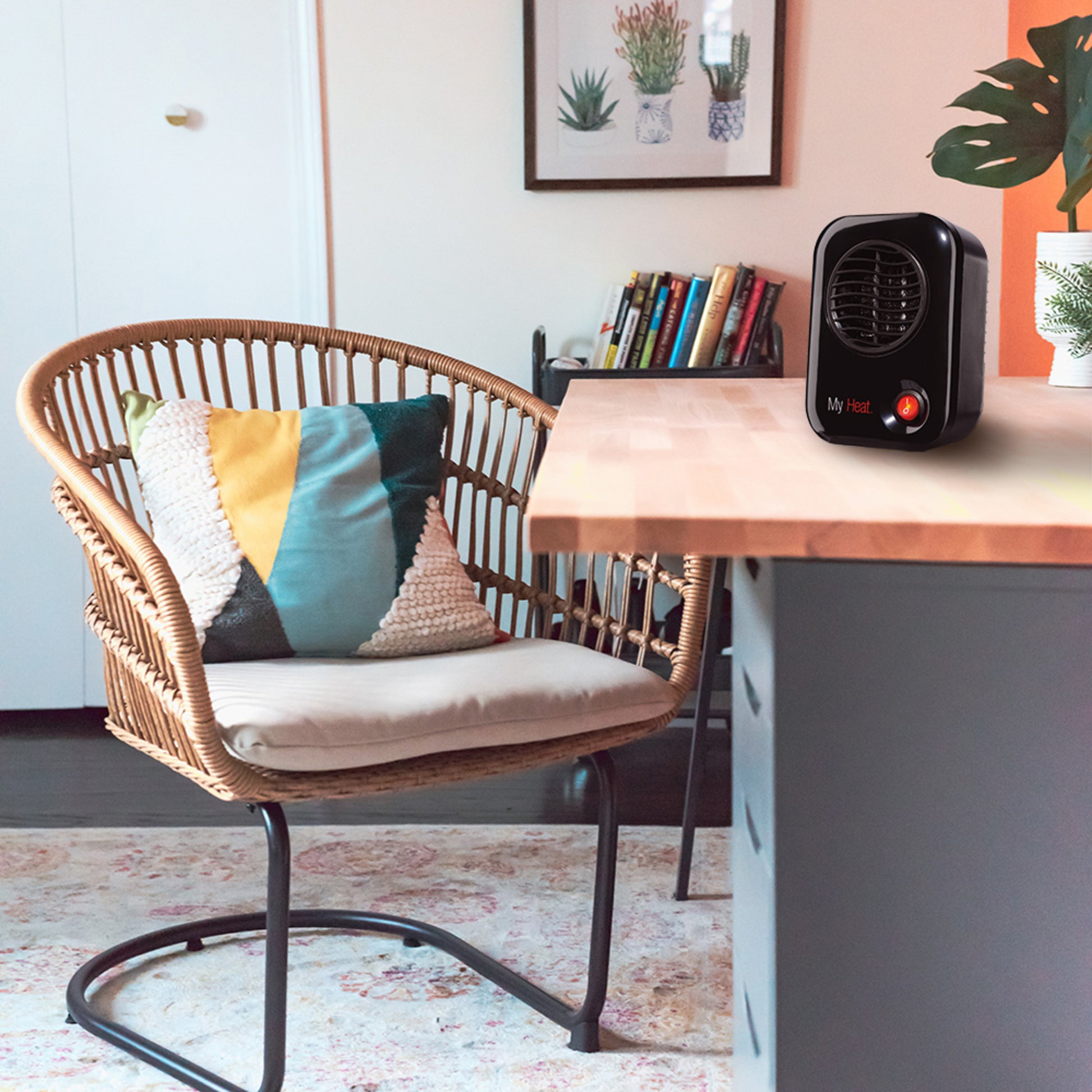 Your Personal Space Heater: At 6 inches tall with a 4” x 4” footprint, this small electric heater takes up minimal desktop space and is intended to heat up your immediate space at home or the office. Designed to warm you, not a room