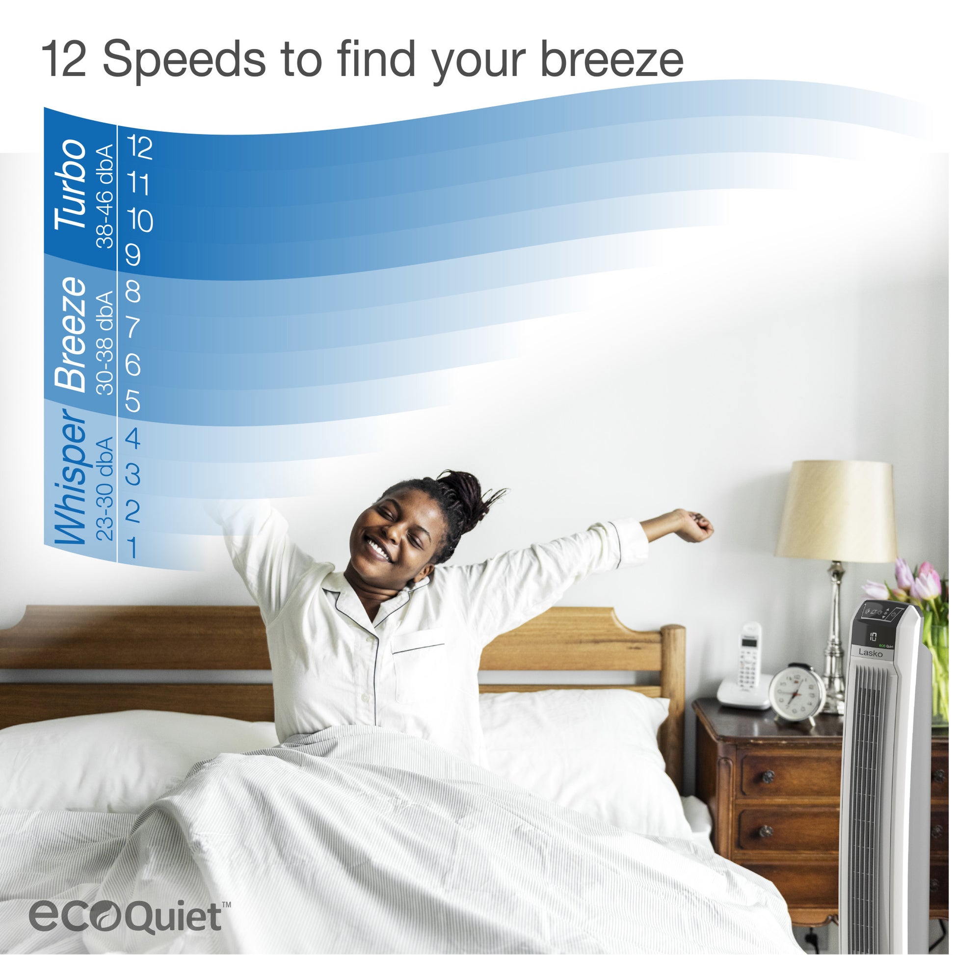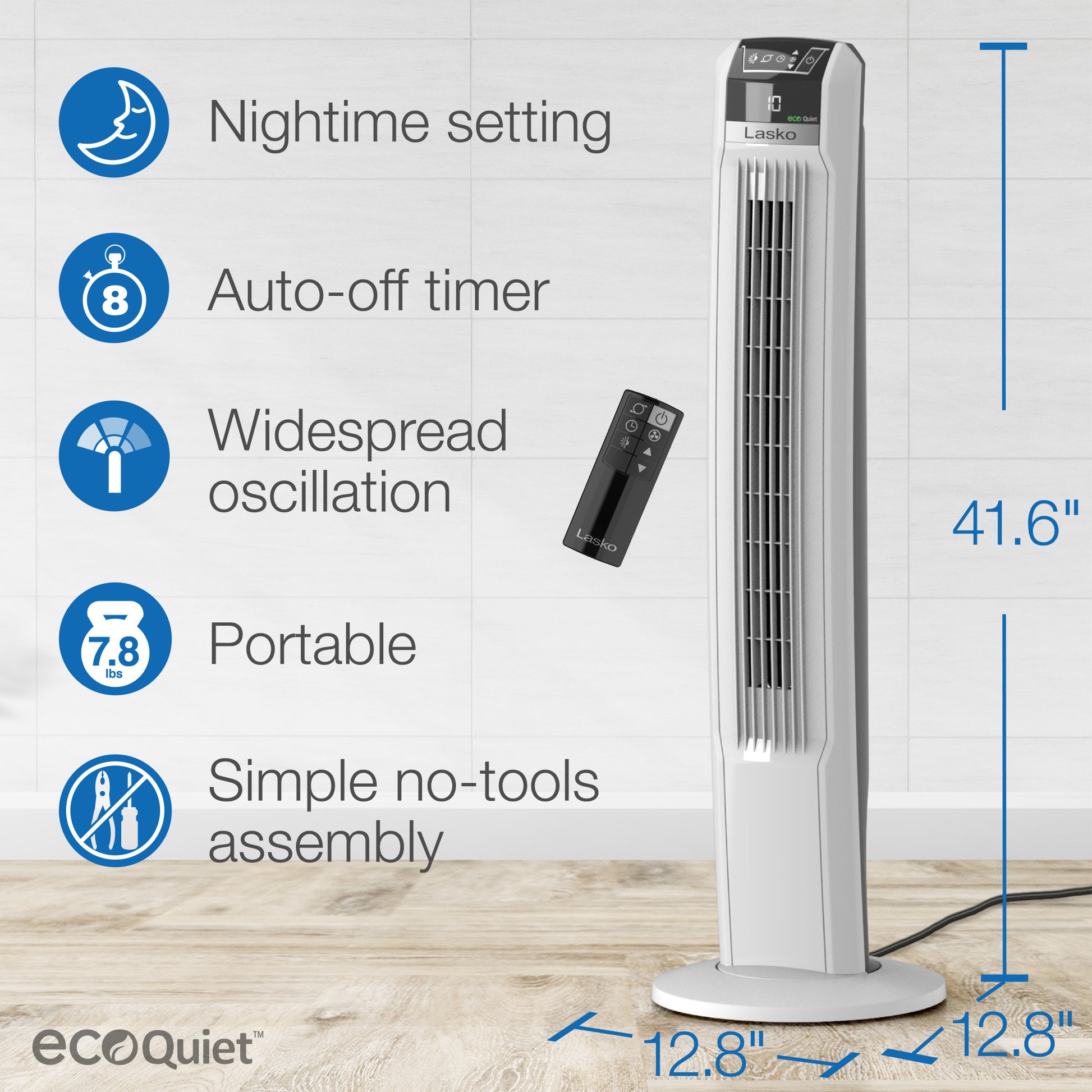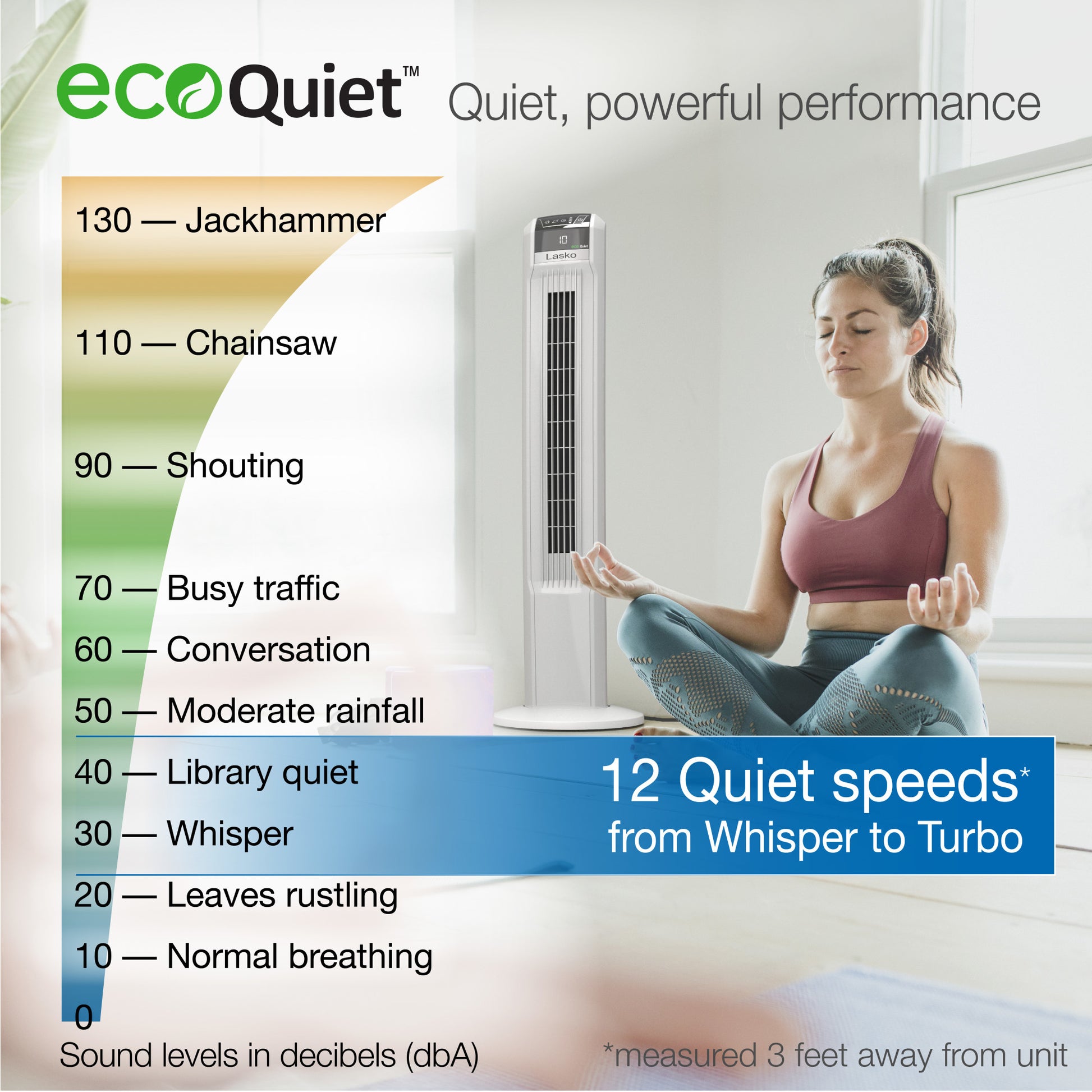 Lasko 42" 12-Speed EcoQuiet DC Motor Tower Fan with Remote Control, T42710, White