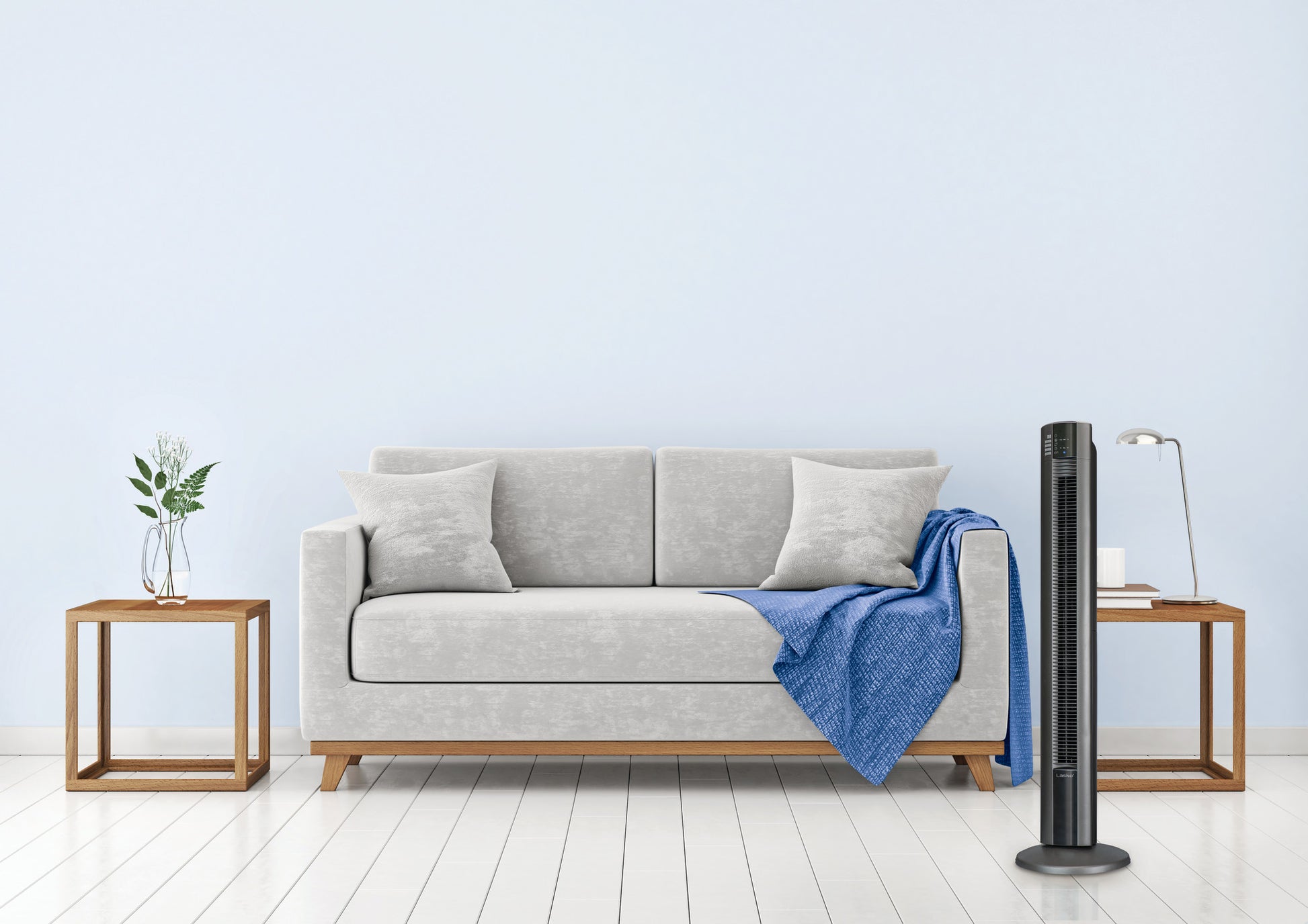With 3 quiet speeds and optional oscillation, this fan brings a cooling breeze and efficient airflow. The 4-foot tall design of the fan means that breeze can reach up and over furniture for maximum comfort.