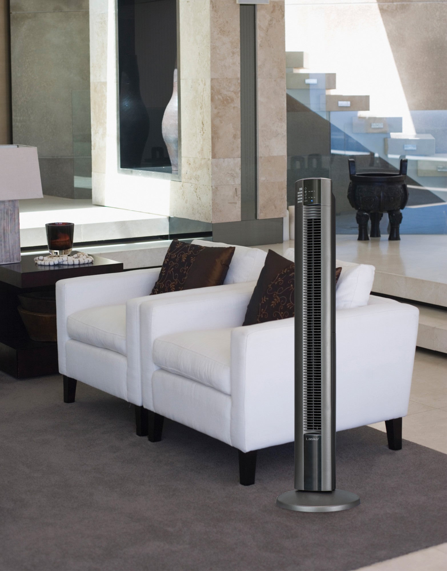 Standing 4' tall, this oscillating Lasko Performance Tower Fan instantly helps create a wind chill effect in your room. The innovative fan features 3 quiet speed settings (low, medium, and high), an extra-long grill for an extended comfort zone, plus widespread oscillation. Use the auto-off timer to set your fan to run for a period of up to 7 hours, then turn off to conserve energy. Includes a multi-function remote control with on-board storage. Comes equipped with the Lasko Blue Plug, trusted safety fuse technology. Simple no-tools assembly required.