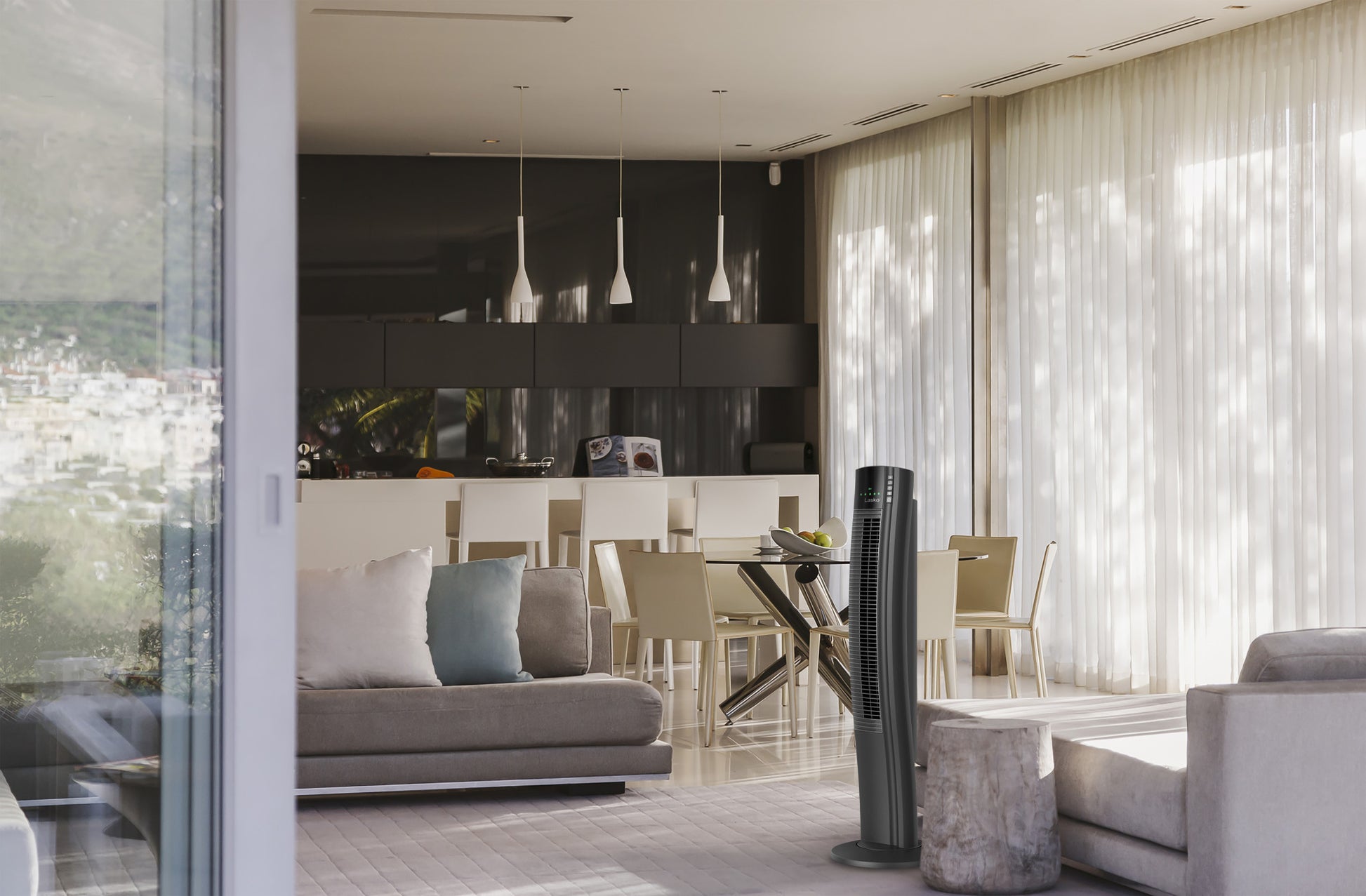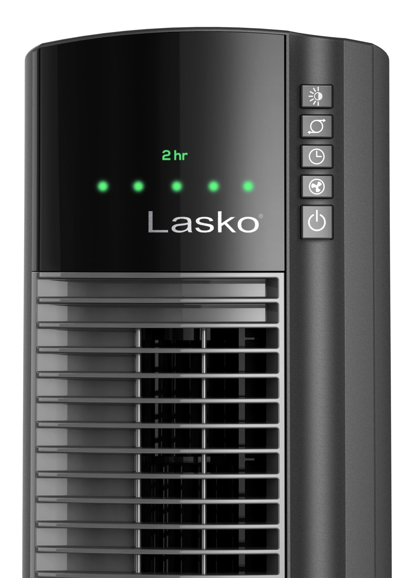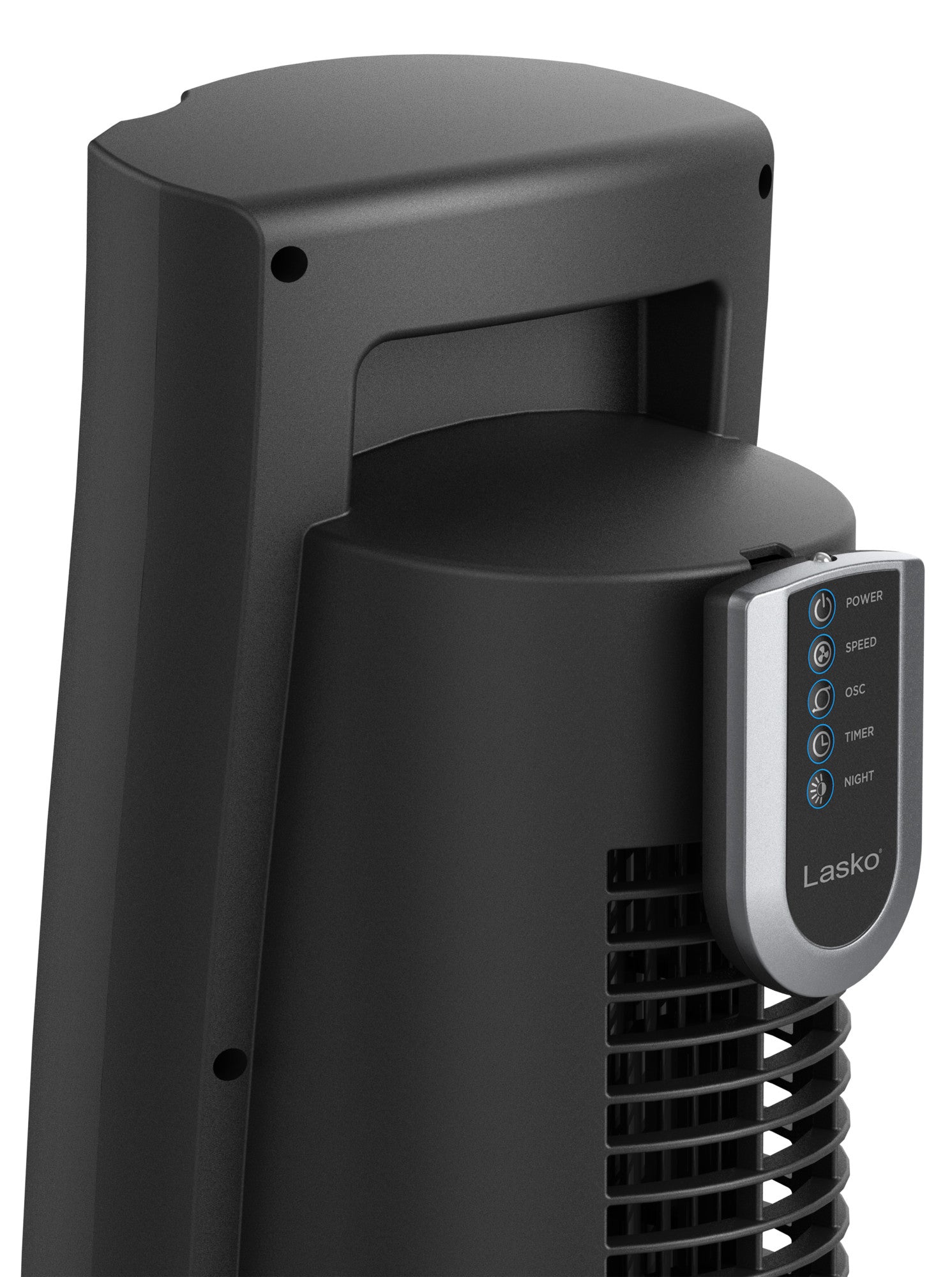 This Lasko Wind Curve® tower fan has a sophisticated, space-saving design that blends beautifully into your home décor. The high-reaching design, 5 speeds, and widespread oscillation provide maximum air delivery and full-room coverage. Set the fan to automatically turn off with the electronic timer option. Plus, the convenient Nighttime setting automatically decreases fan speed and dims controls for overnight use. The remote control operates all of the fan's functions from a distance. Includes a built-in carry handle and on-board remote control storage. Comes equipped with trusted safety fuse technology. Simple base assembly required. 1-year limited warranty.