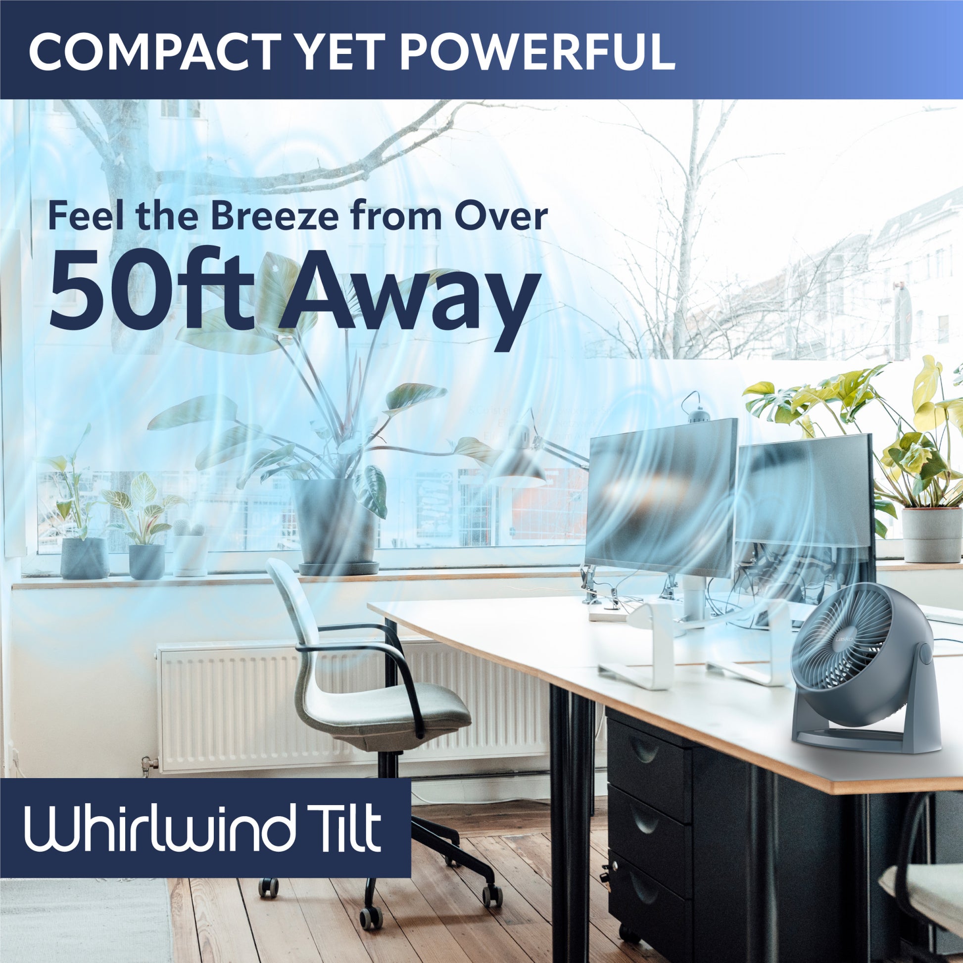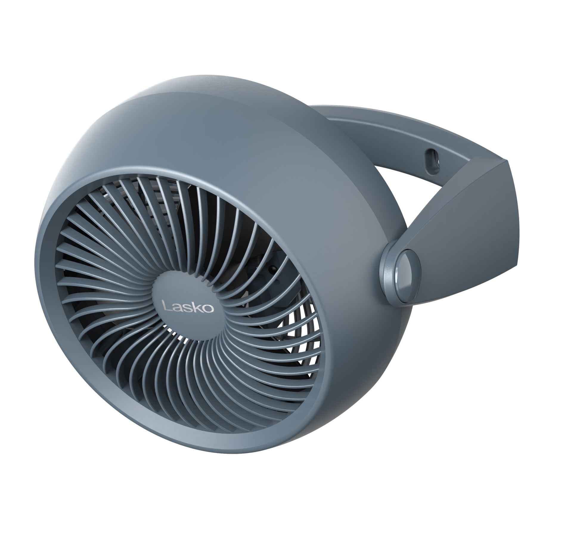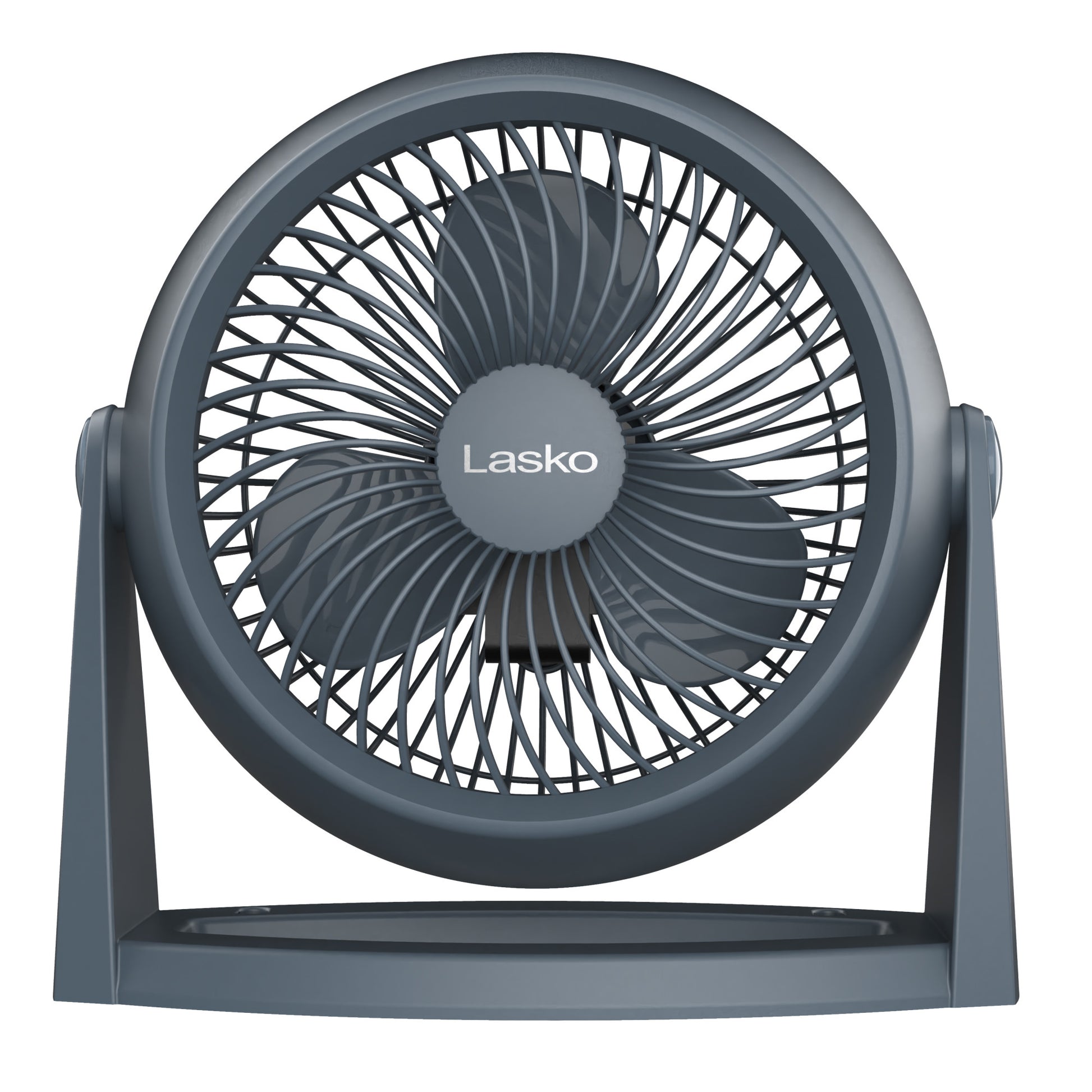 Elevate your comfort with the Lasko Whirlwind Tilt Tabletop 360° Fan in Slate. This powerful tabletop fan is thoughtfully engineered to enhance your living spaces, delivering refreshing airflow and modern styling all in one. With the 360-degree adjustable tilt mechanism, you have the power to direct the airflow precisely where you need it. Say goodbye to stagnant air and hello to powerful circulation that transforms any room into a haven of comfort. It combines the convenience of a compact fan with the noticeable power that can be felt even from a distance of 50 feet! The space-saving design of this compact fan makes it perfect for bedrooms, dining rooms, living rooms, and more, it seamlessly fits on your table or the floor. Even better, you have the flexibility to mount it on the wall, freeing up valuable table or floor space. The Whirlwind fan will add a touch of sophistication to any space, and it effortlessly merges with your décor, whether mounted or freestanding (Mounting hardware not included). Efficiency and eco-consciousness meet in perfect harmony with this fan. It delivers an impressive punch of cooling power while keeping energy consumption at bay. You can relish the revitalizing airflow without the guilt of excessive electricity usage. Customize your cooling experience effortlessly with the user-friendly control knob mounted on the back. Choose from 3 speed settings - low, medium, and high - to match your room requirements. With Lasko, safety is paramount. Our trusted Safety Fuse Technology guards against electrical faults, utilizing an integrated fuse to keep you and your loved ones safe. You can relax and enjoy cool, refreshing breezes with peace of mind. When you choose Lasko, you choose a century of trusted quality since 1906. Our Whirlwind Tabletop Fan is proudly designed and engineered in the USA, promising reliability, and performance you can count on. We offer a 1-Year Limited Warranty, so you can enjoy your Lasko fan with complete confidence.