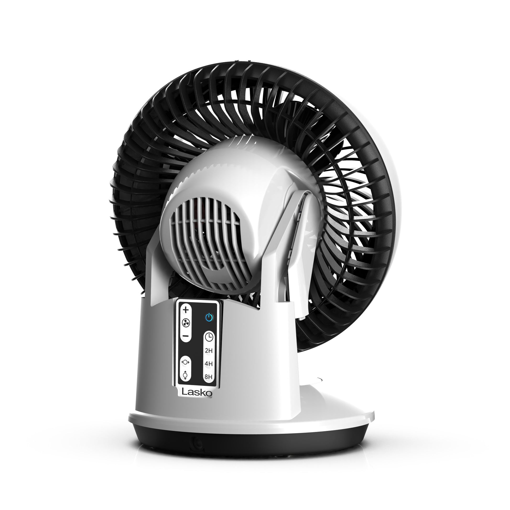 The Whirlwind A12557 White Orbital Motion Air Circulator with Remote Control from Lasko features orbital motion that is designed to oscillate vertically and horizontally or both simultaneously for maximum room coverage, features a 60° horizontal swing, 90° by 60° orbital motion or 90° vertical lift. This small but mighty fan will move air up to 1150 feet per minute and circulates the air up to 25.6 times per hour in a small room and 13.1 times per hour in medium sized rooms. Use the convenient comfort controls to select from 3 speeds ranging from quiet to powerful. The Dark Mode feature will automatically turn off the display lights after 5 seconds to create a more pleasant user experience. The multi-function remote control will operate this tabletop fan from a distance. Plus, there is storage for the remote on the back of the fan. Equipped with The Blue Plug, Lasko's Trusted Safety Fuse Technology. Come fully assembled with a 1-year limited warranty. Condition: New