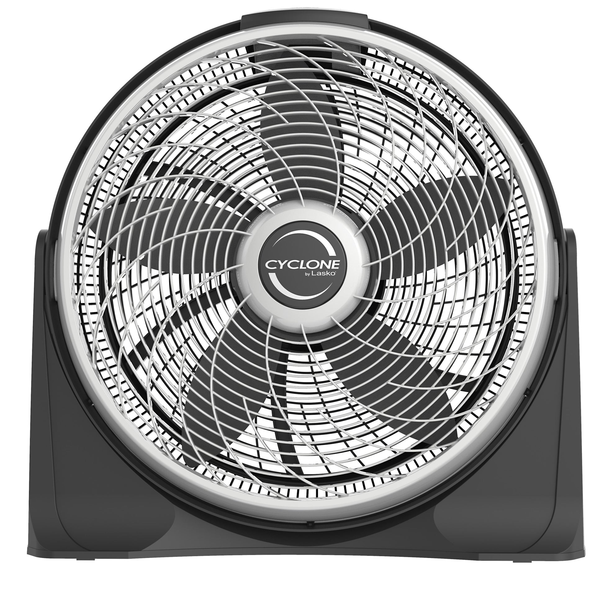The Lasko 20" Cyclone Air Circulator Fan is a great choice for an all-purpose floor fan. This fan is a great addition to boost your air conditioning circulation, exhaust stale air, or simply provide a refreshing breeze. This fan's auto-off timer function, 4 quiet high-performance speeds, aerodynamic fan blades, and a special swirling grill design combine for high power and performance. The adjustable fan-head rotates up to 90 degrees and then locks into place for precision comfort. This fully assembled fan is portable with a built-in carry handle and durable with high-impact plastic construction. Simple to operate with top-mounted controls and multi-function remote. Easily converts from wall to floor use. Comes fully assembled. 1-year limited warranty.