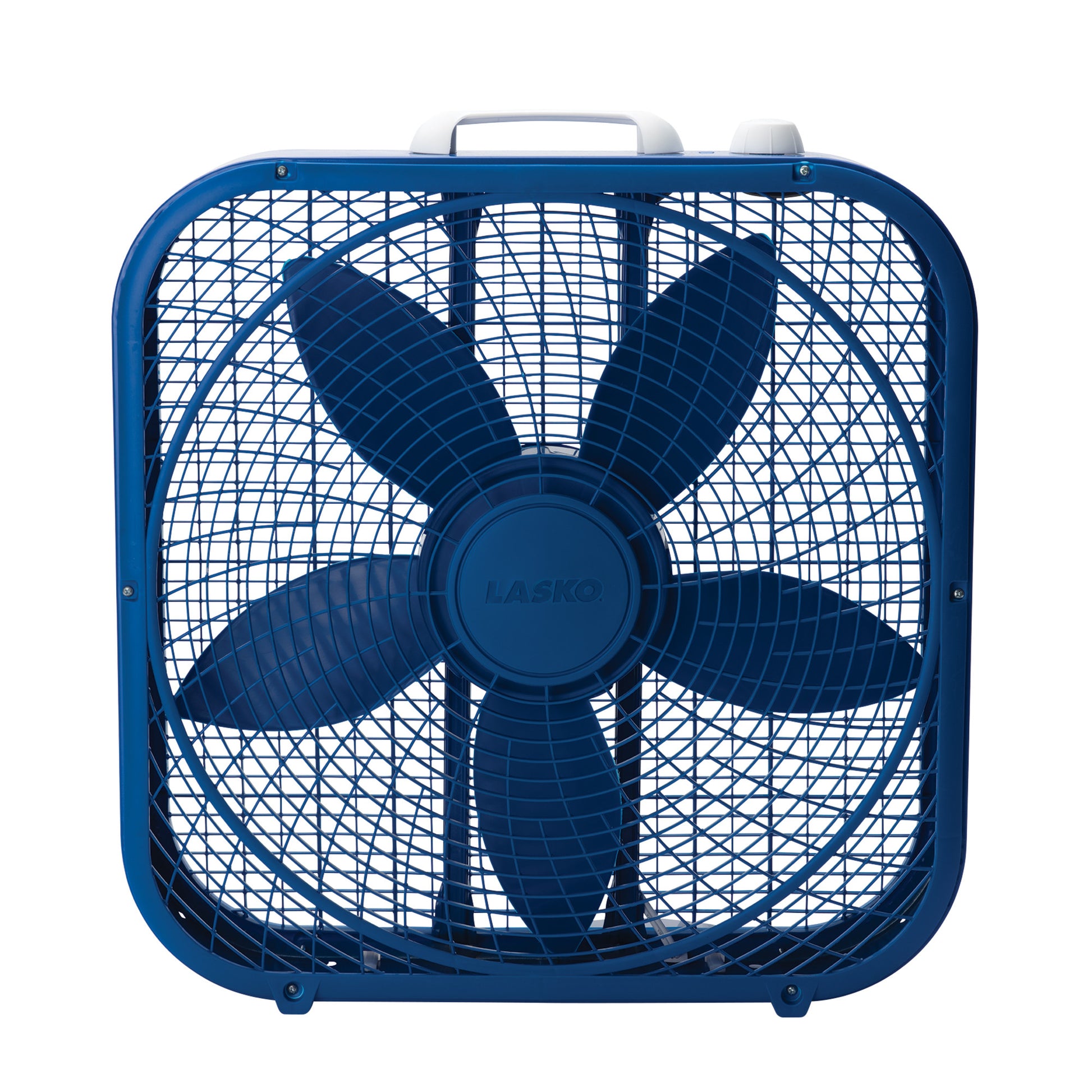 Lasko's 20" Cool Colors Box Fan in cheerful blue has 3 quiet speeds, Save-Smart® energy efficiency (costs less than 2¢ per hour to operate), a durable steel frame, and a built-in carry handle. It's the perfect box fan for dorms, yoga studios, or any room that needs cooling airflow. Features a weather-resistant motor for worry-free indoor window use. Equipped with Blue Plug safety fuse technology, making this fan a safe and an energy-efficient option. 1-year limited warranty. Condition: New