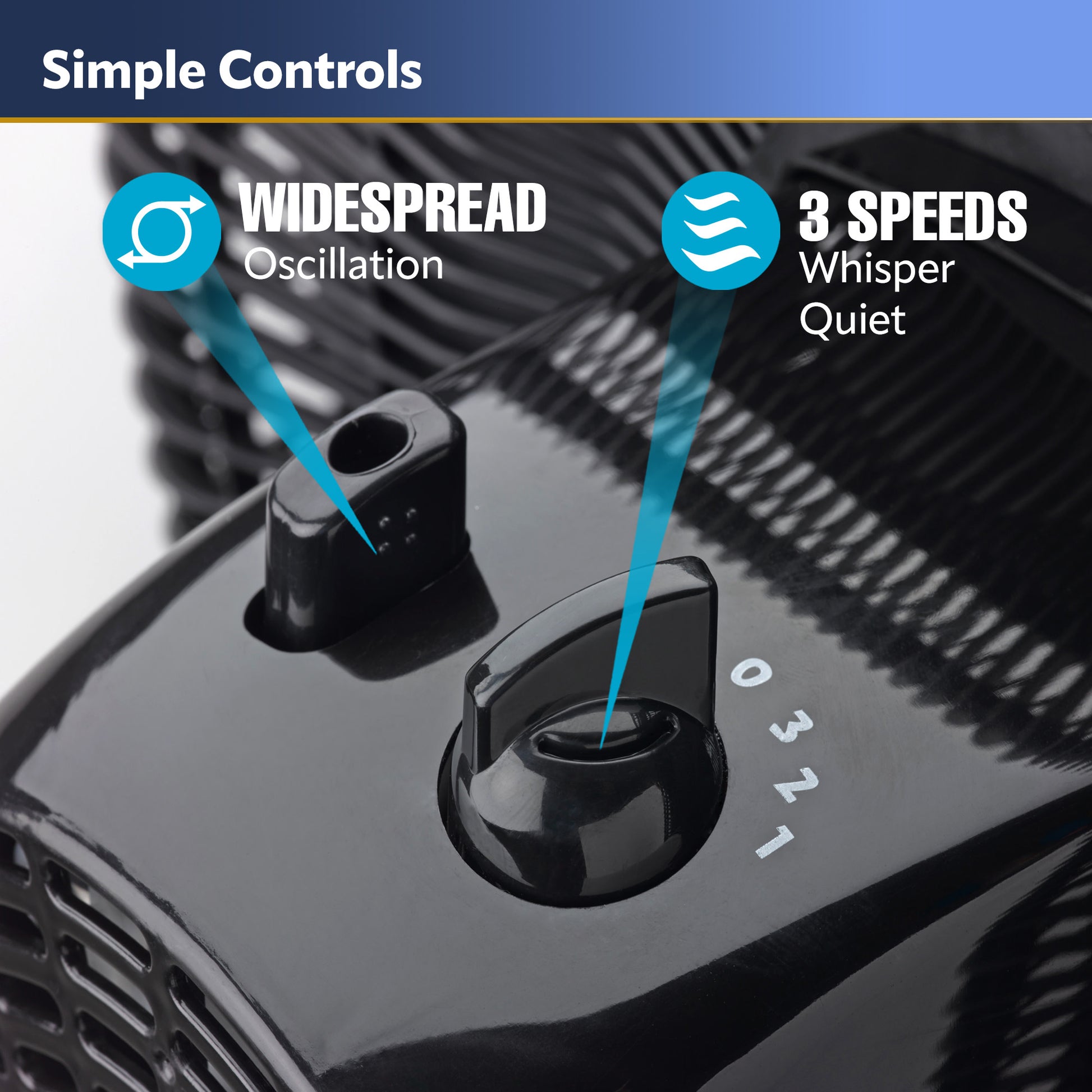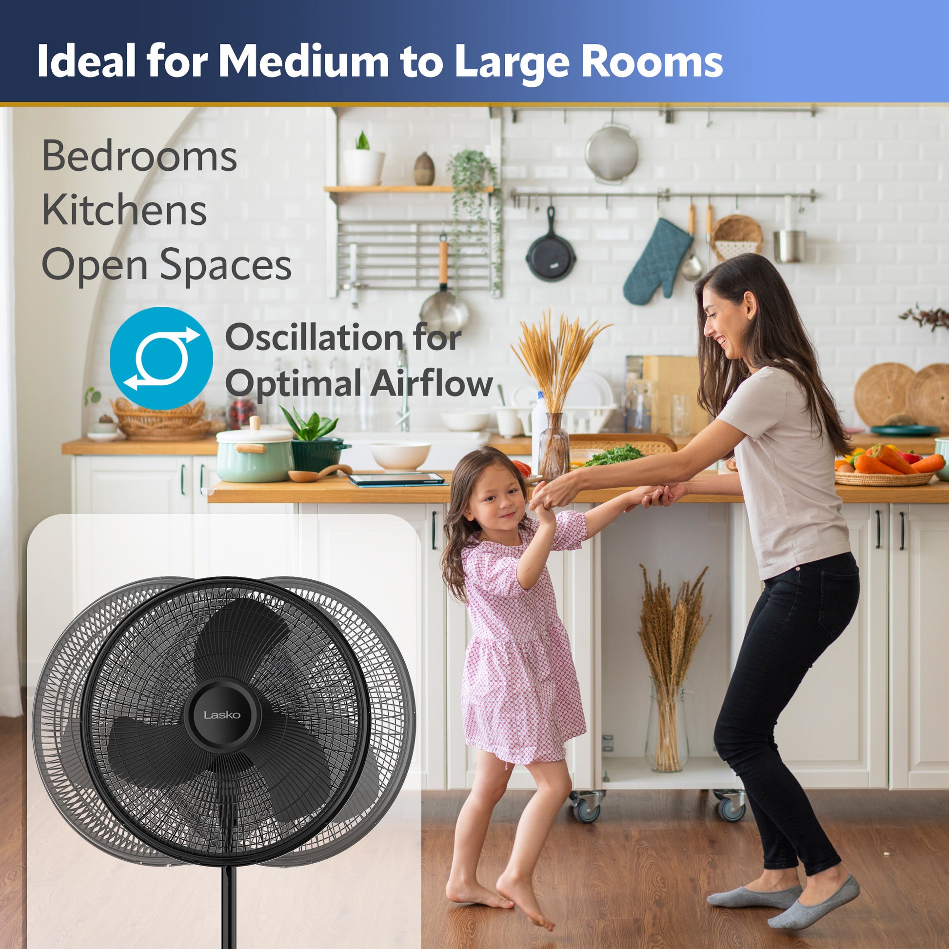 Enjoy a cool breeze in every room with the black Oscillating Multi-Purpose Stand Fan by Lasko. It is great for use in homes, offices, and more. The generous 16-inch diameter blade provides a powerful flow of cooling air that is adjustable to 3 quiet speeds. With its tilt-back fan head feature, you can set this pedestal fan to blow the air up towards the ceiling, creating comfortable air circulation throughout the room.