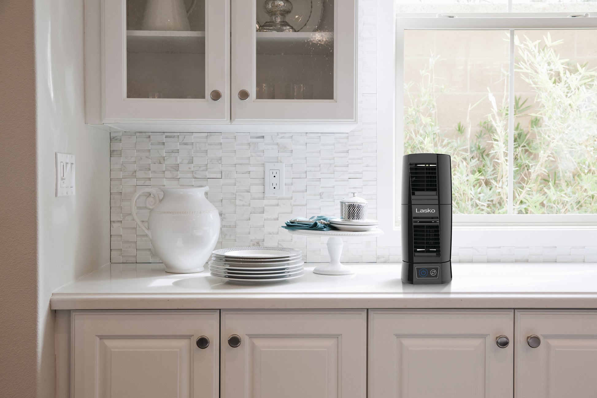 The Desktop Wind Tower from Lasko is an oscillating, multi-directional fan sized perfectly for personal use on tabletops, counters, or at your office work space. The top portion of this portable fan pivots a full 360 degrees, so you can position the cooling airflow precisely where you need it. Additionally, the bottom section of the fan has an oscillation option, which provides a wide sweep of air throughout your space. This space-saving electric fan features 2 quiet speeds and front mounted controls for easy access. For your peace of mind, this fan includes Lasko's trusted safety fuse technology -- The Blue Plug. Comes fully assembled.