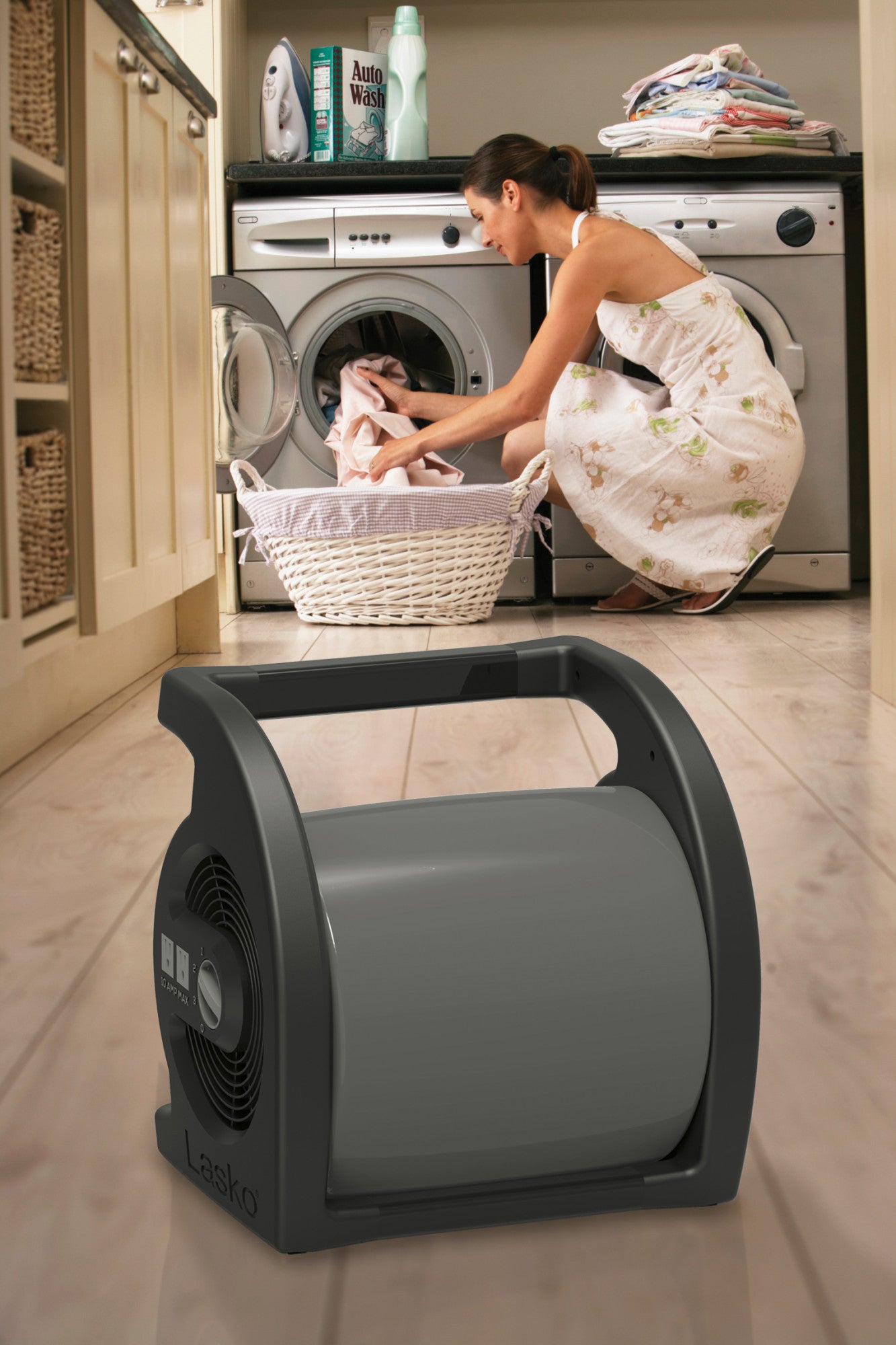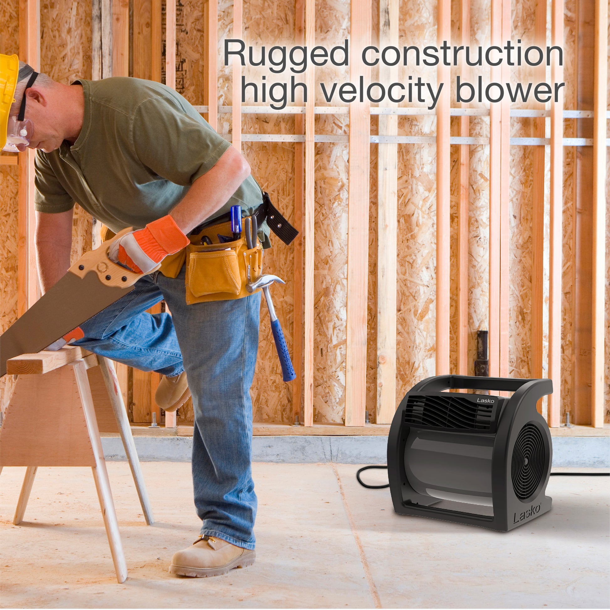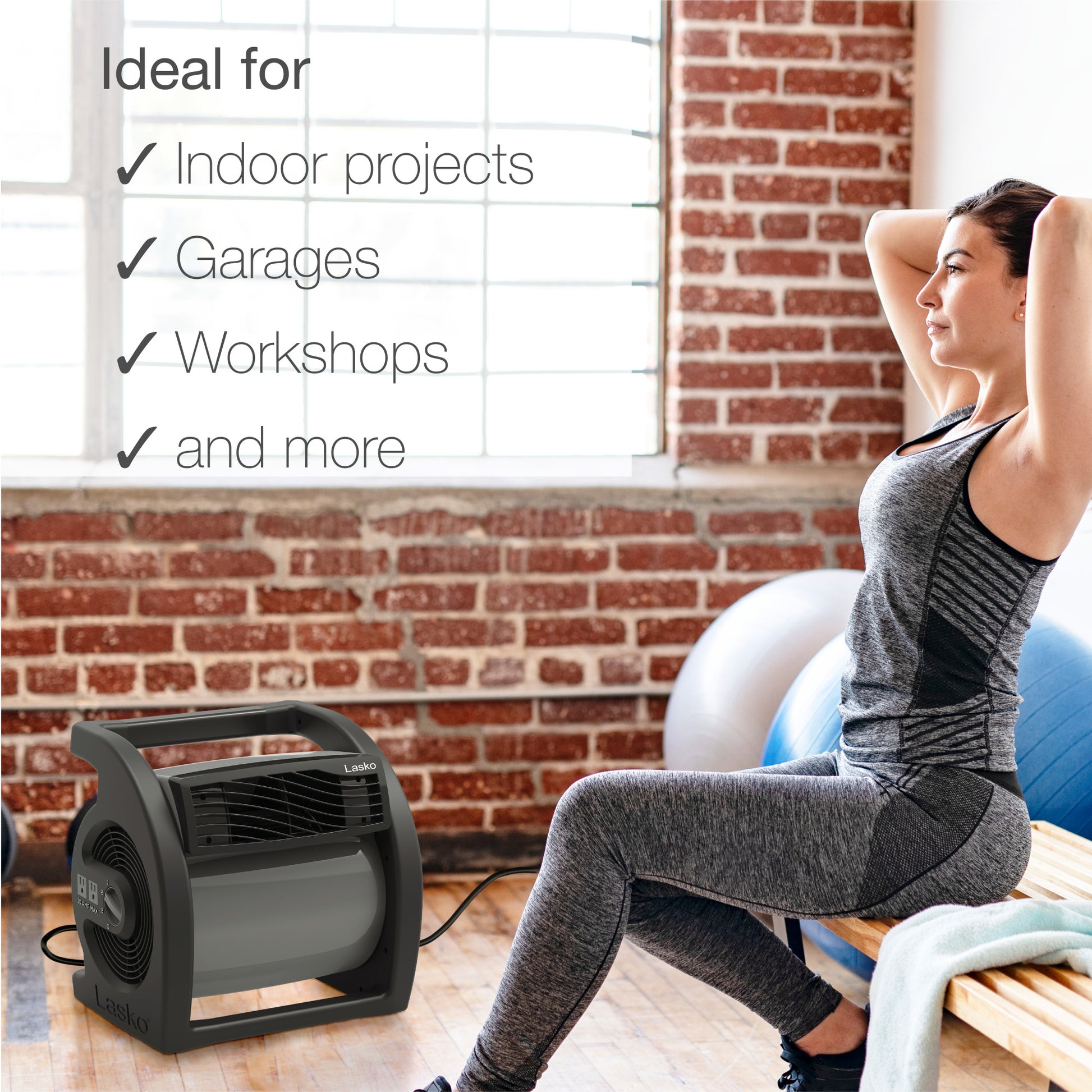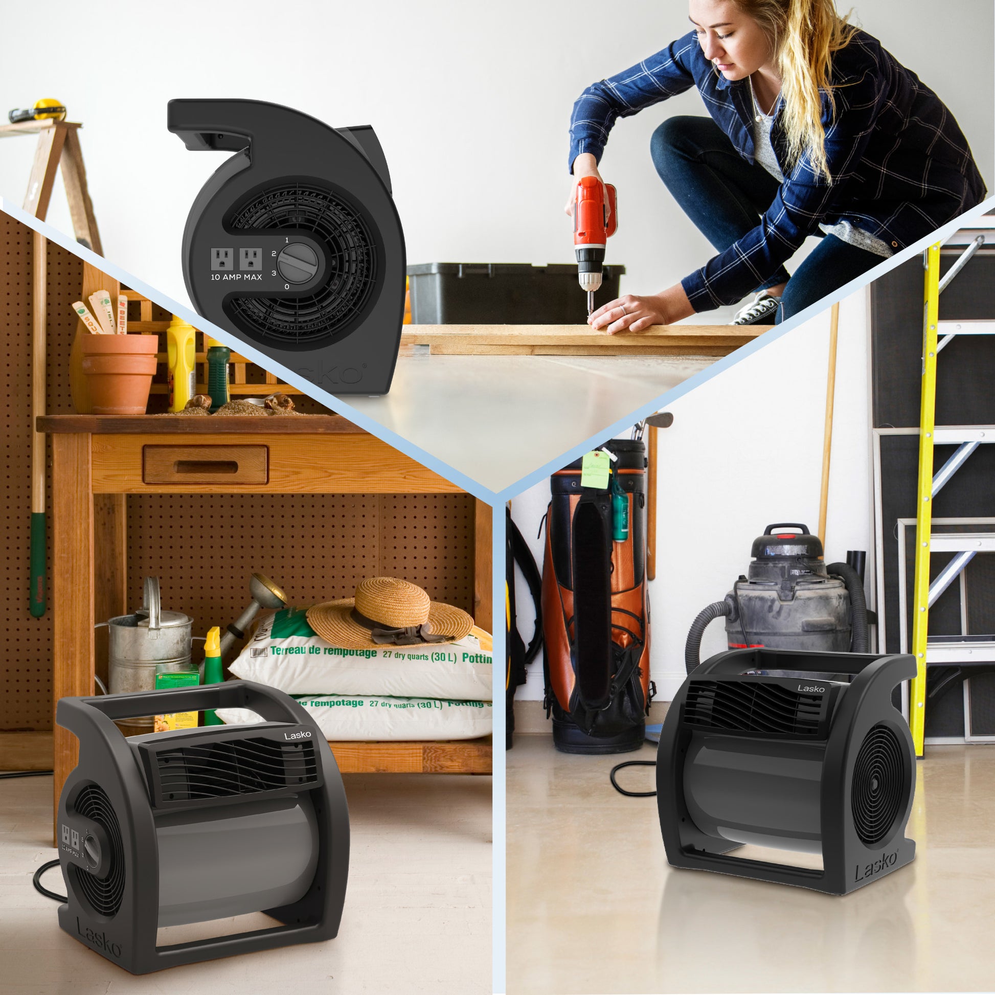 The Max Performance Pivoting Utility Fan by Lasko is constructed with 3 powerful speeds and a pivoting blower, which make this an ideal solution for drying, exhausting air, ventilating, and more. Rugged in design, it's a handy choice for your basement, workshop, garage, basement or work site and can stand up to tough use. Two on-board 120-volt outlets allow you to connect multiple fans or plug in accessories, like a work light. This powerful fan produces high-velocity, focused air stream for full-room circulation. Equipped with an integrated carry handle and extra long 9.5 foot power cord with 3-prong grounded plug, this essential utility fan comes fully assembled. 1 year limited warranty.